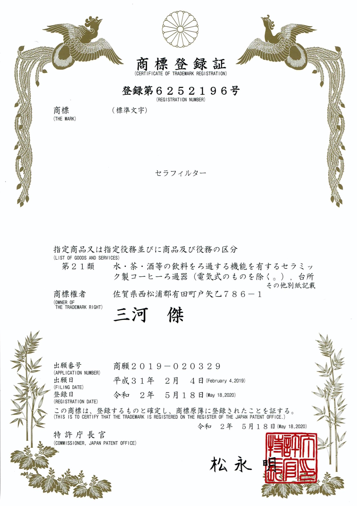 「セラフィルター」は、当社代表 三河が商標登録済み商品名です。