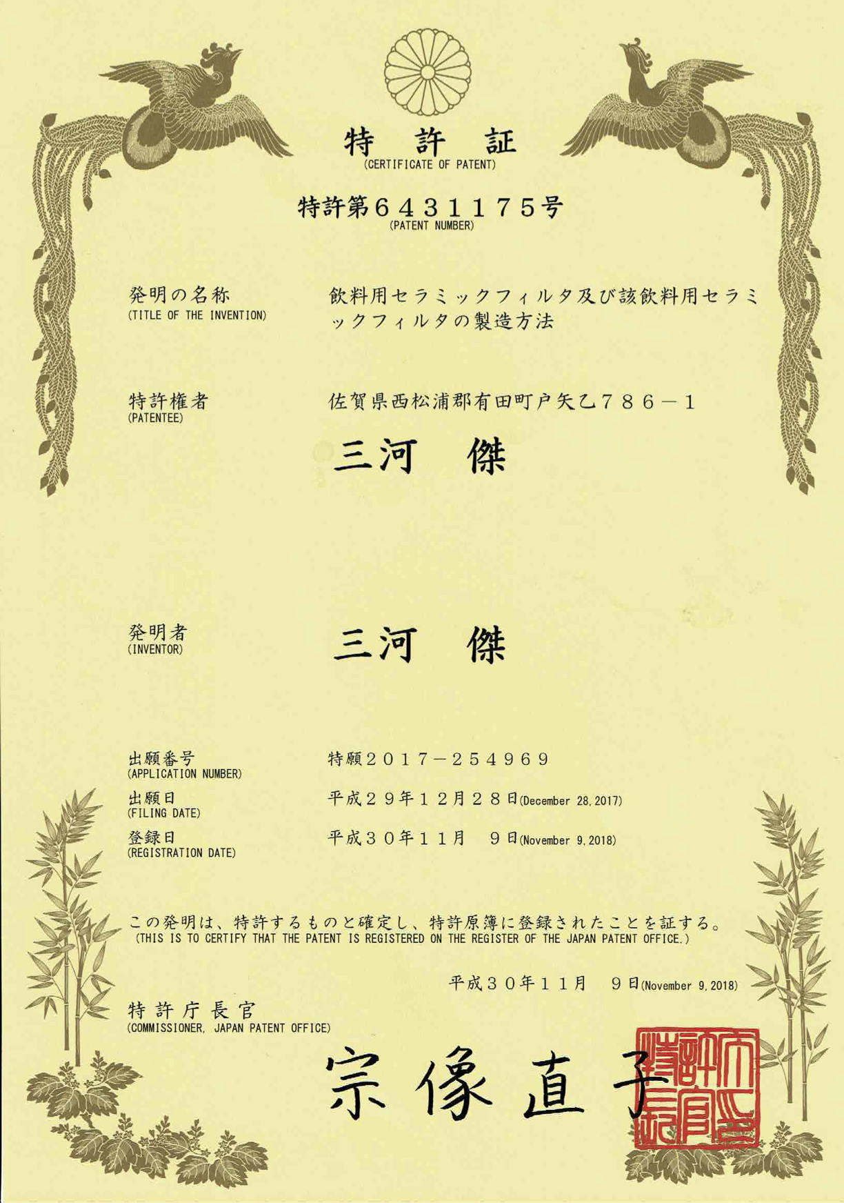 Our original product “Cerafilter” has obtained a patent in Japan and the United States for its manufacturing method.