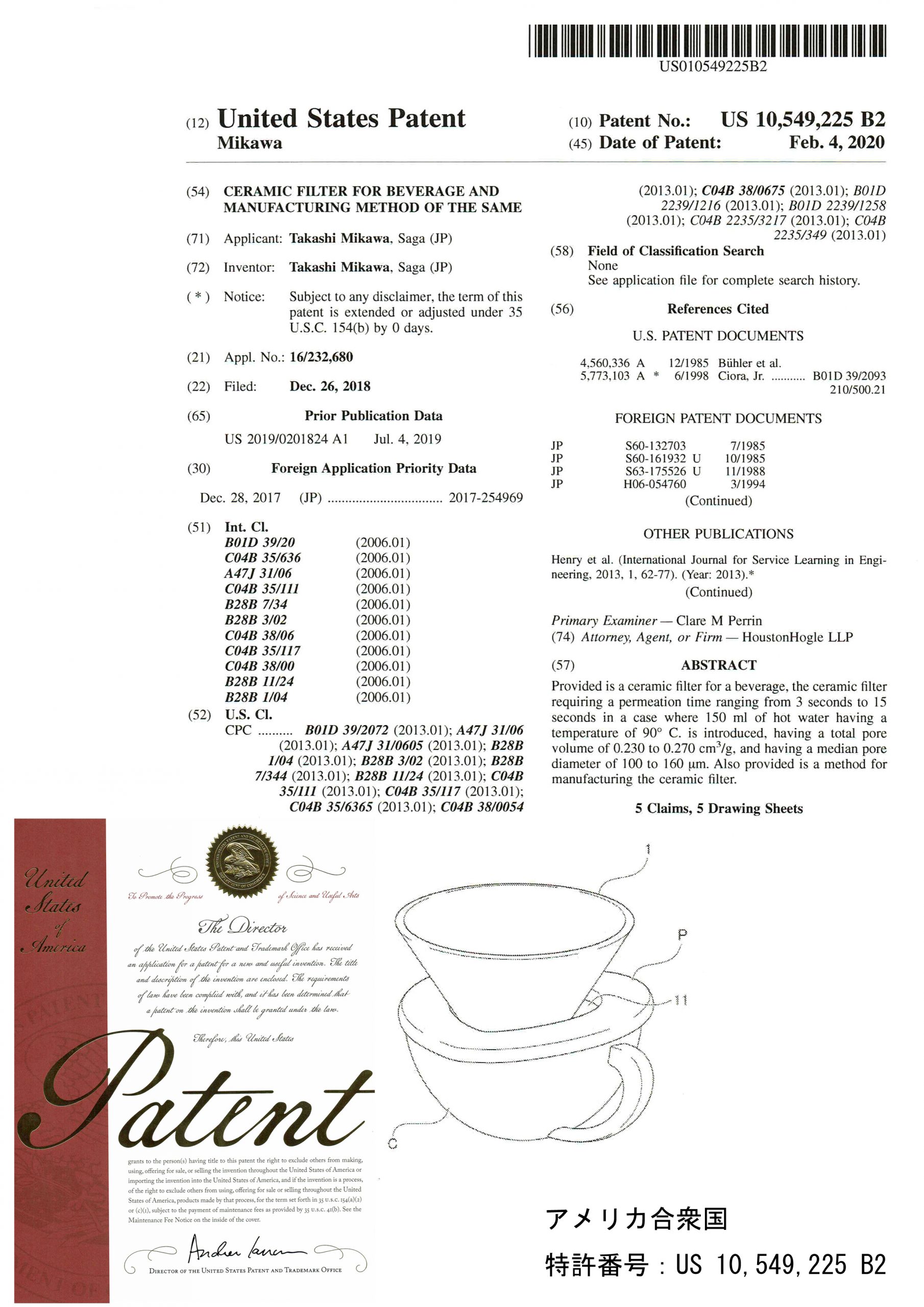 弊社のオリジナル商品「セラフィルター」は、その製造方法において日本とアメリカで特許を取得しております。